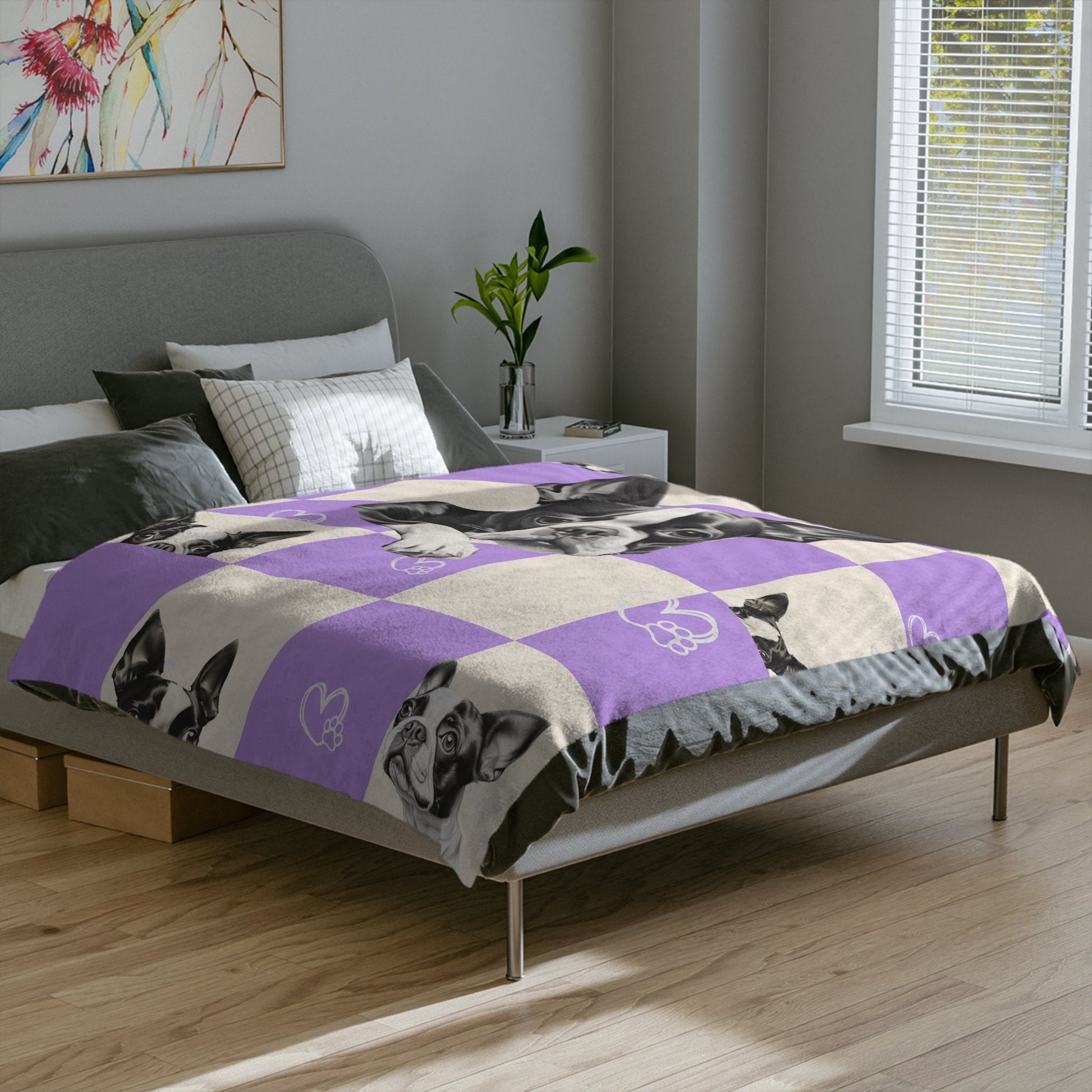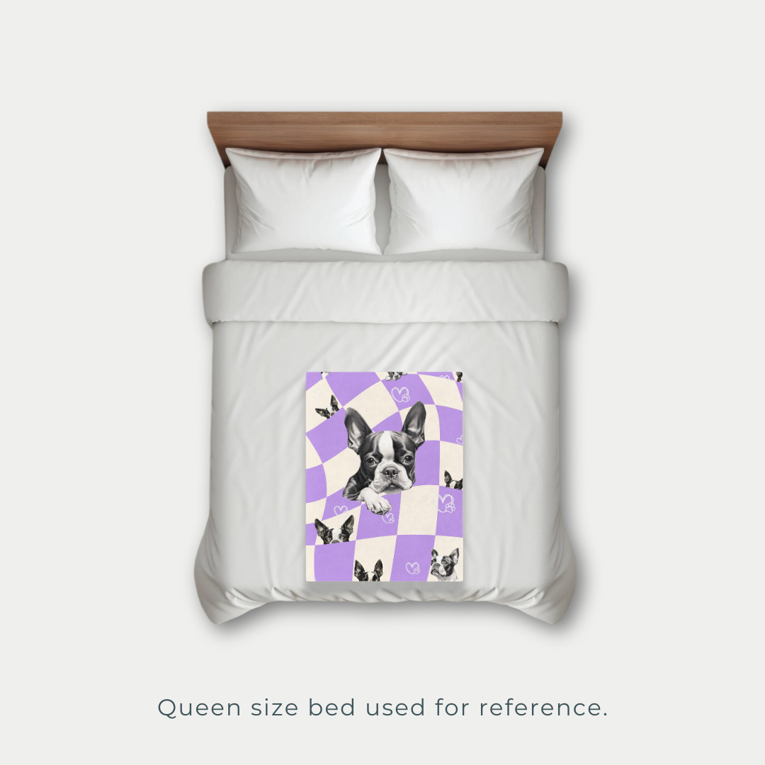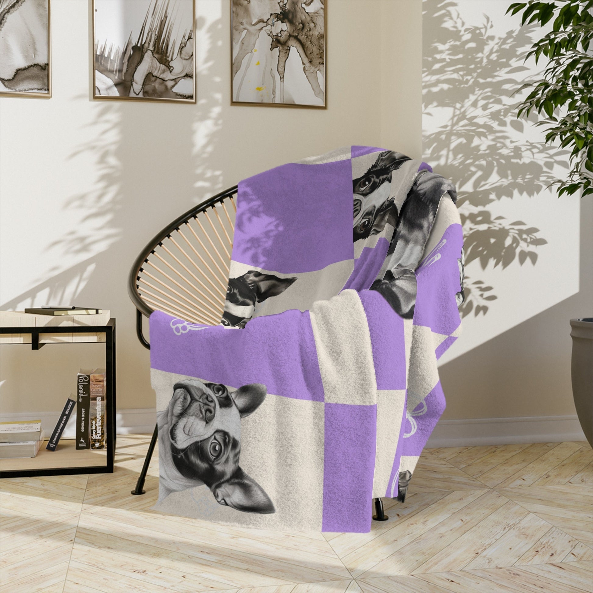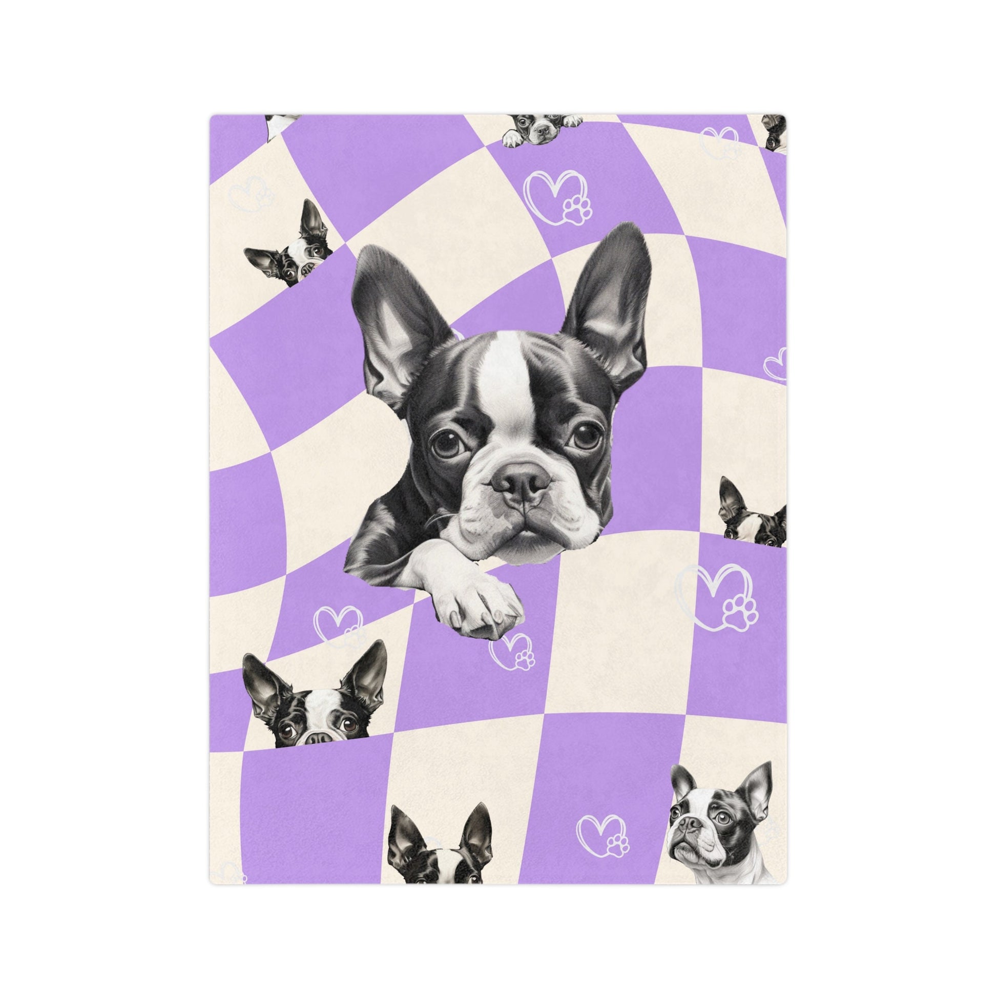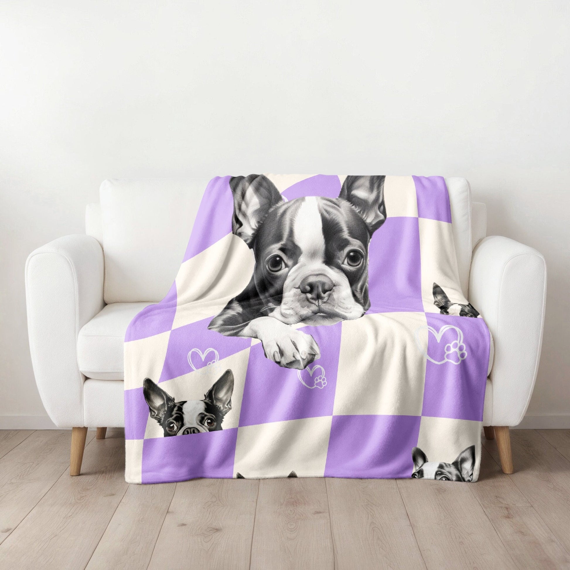 Introducing our Boston Retro Dog Blanket - a unique and striking design featuring adorable Boston Terriers peeping through a retro wavy checkerboard pattern. This cozy fleece minky blanket is the perfect gift for Boston Dog Moms, Boston Dog Owners, and even new Boston Puppy parents. Get ready to snuggle up in style with this one-of-a-kind blanket!