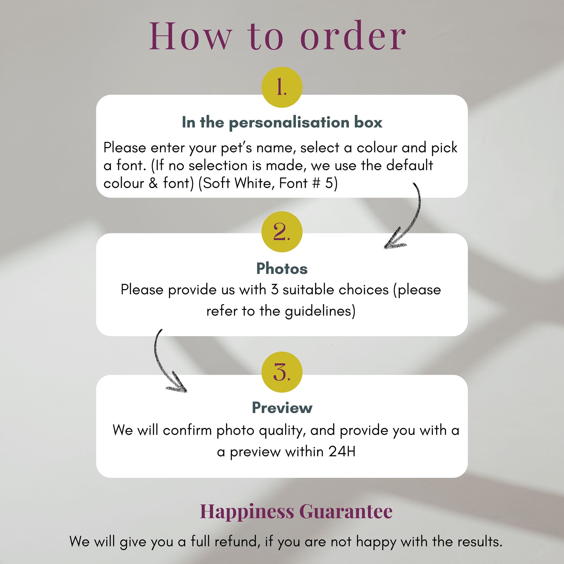 To ensure the best possible portrait, we recommend following our photography tips and providing multiple pictures of your pet for the best pose, angle, and lighting. Once you've approved the low-res preview, you'll receive a high-resolution printable file of your custom portrait.