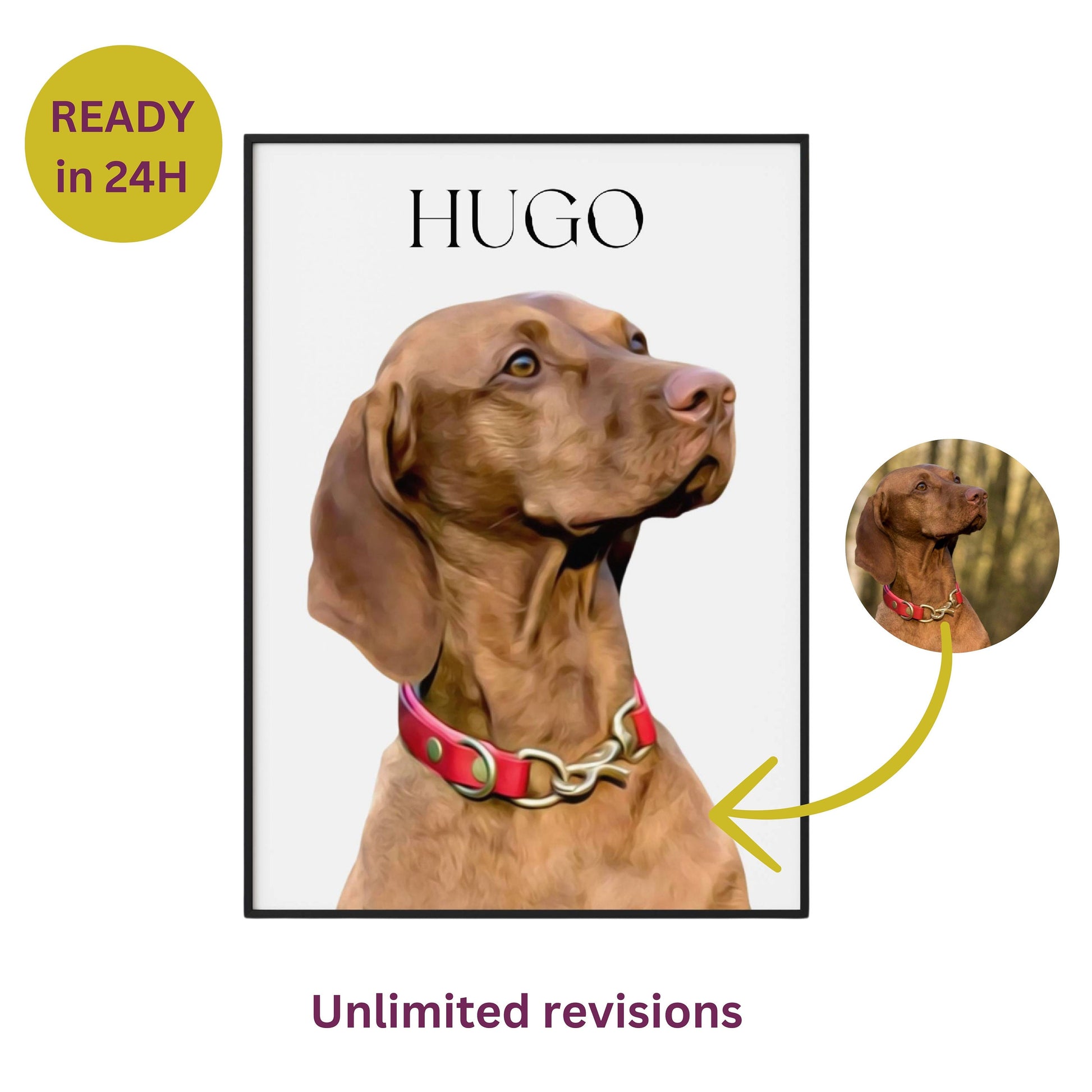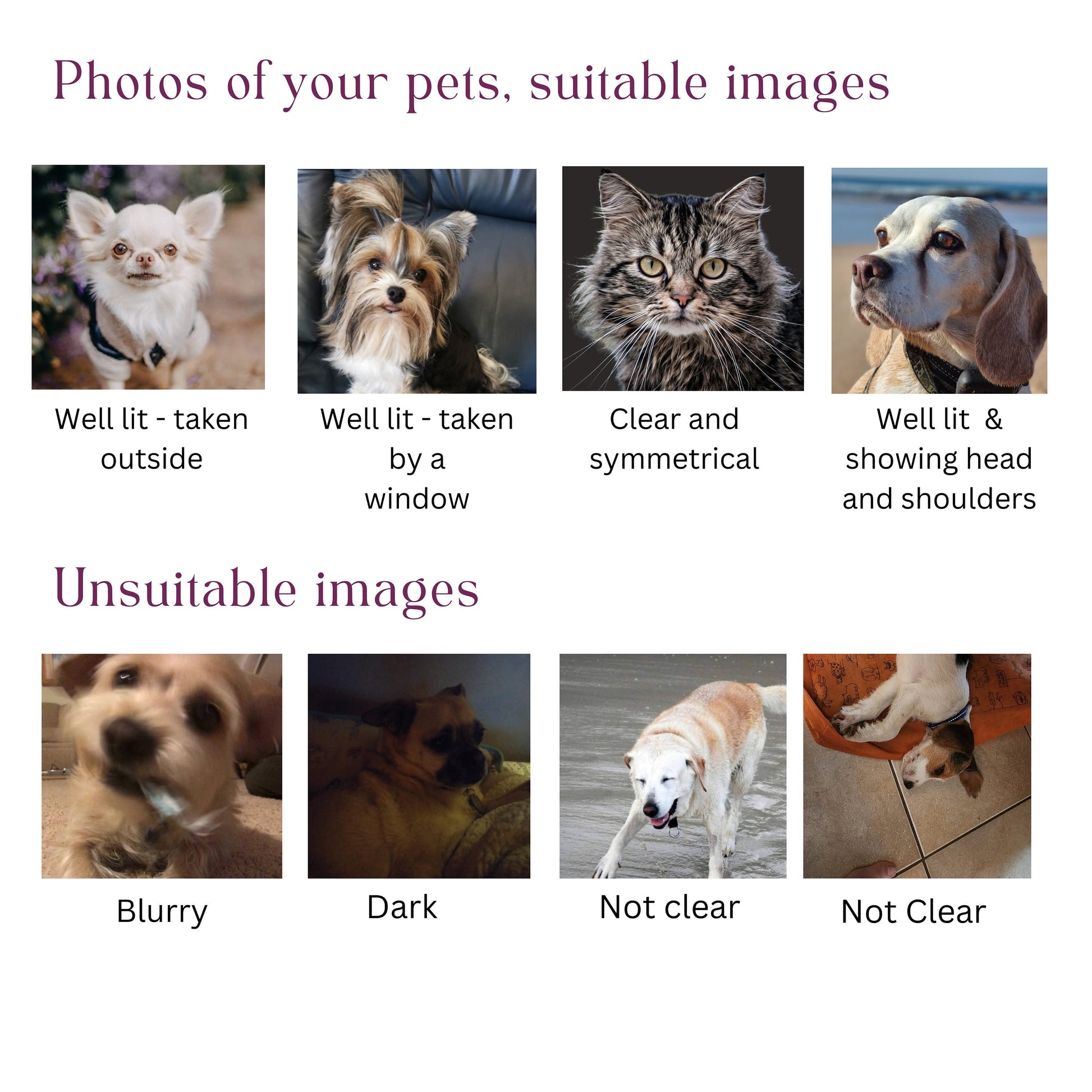 To ensure the best possible portrait, we recommend following our photography tips and providing multiple pictures of your pet for the best pose, angle, and lighting. Once you've approved the low-res preview, you'll receive a high-resolution printable file of your custom portrait.
